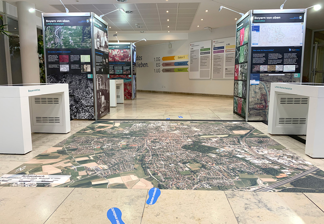 Anlässlich des fünfjährigen Bestehens des Bayerischen Landesluftbildzentrums stellte die Wanderausstellung dessen Angebote einem breiten Publikum vor. Die multimedial gestaltete und leicht verständlich aufbereitete Ausstellung vermittelt einen spannenden Einblick in die Geschichte und Technik der Luftbildfotografie. Auf 14 Ausstellungstafeln wurde den Besucherinnen und Besuchern gezeigt, wie Luftbilder gemacht werden, wie sie aufbereitet werden und wo sie eingesetzt werden.